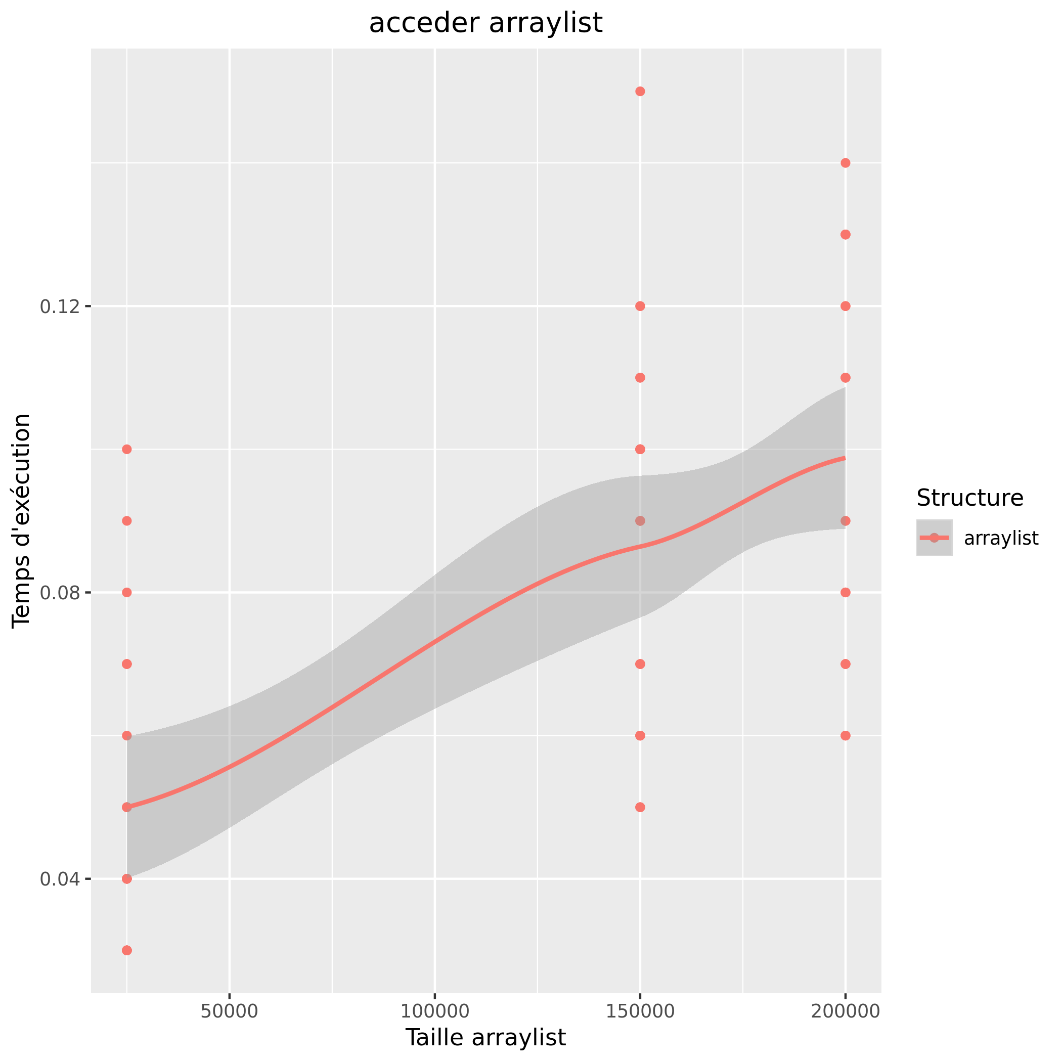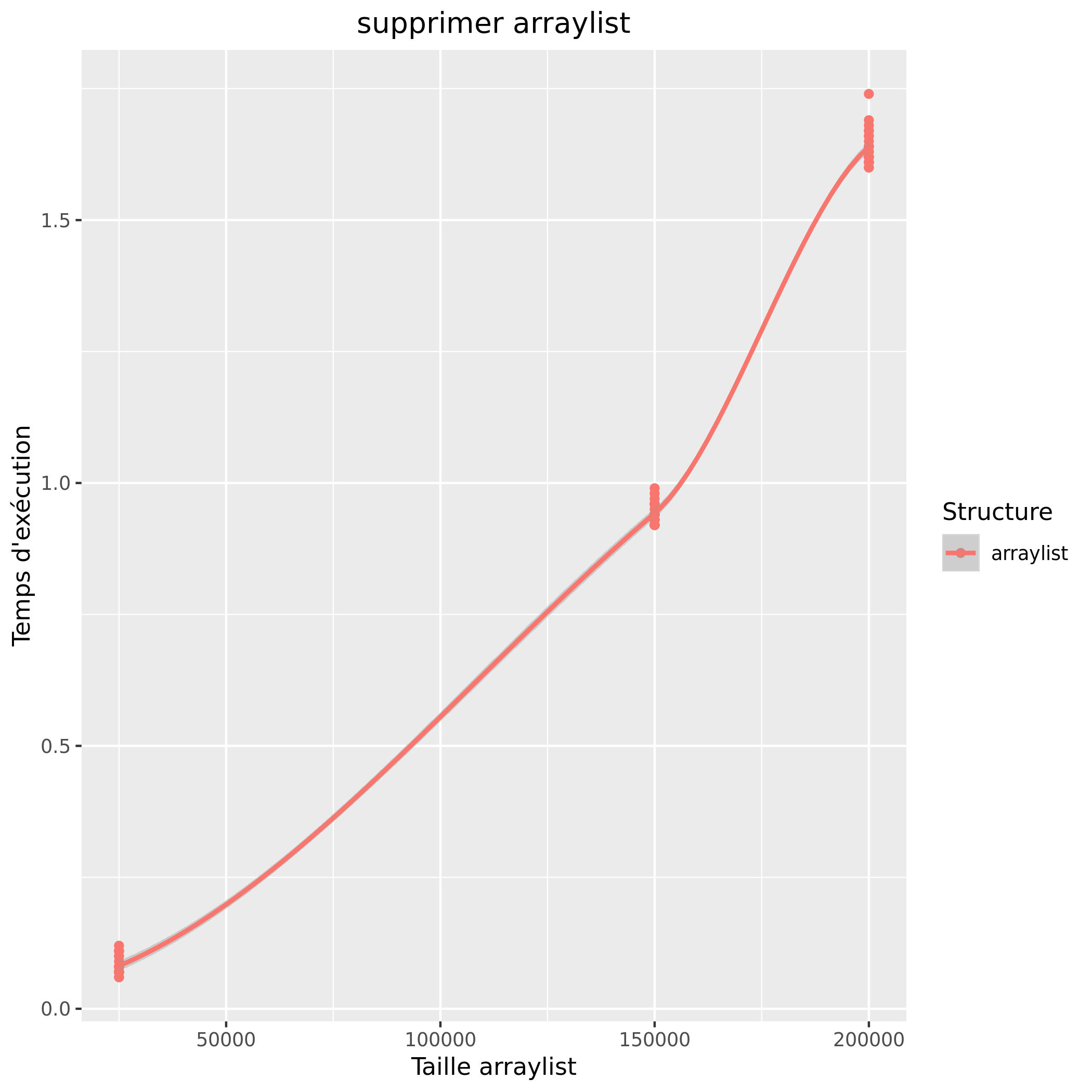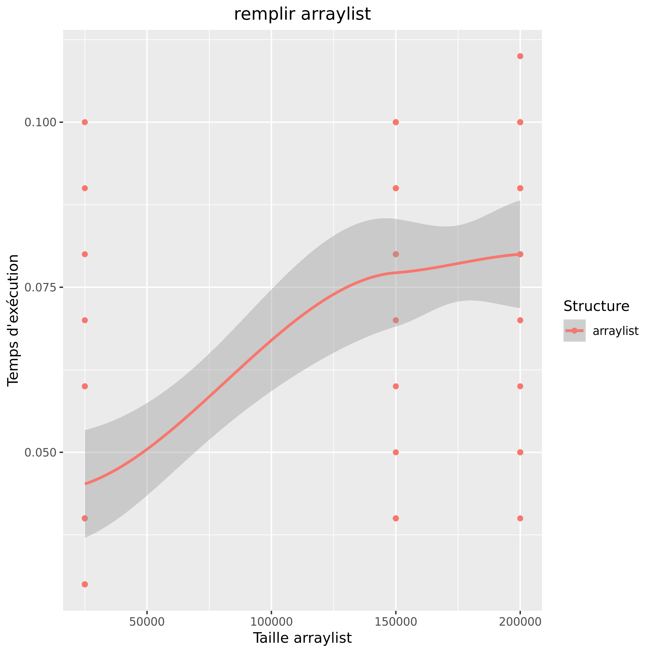 -    ggtitle("Remplir ArrayList") + xlab("Taille de l'ArrayList") + ylab("Temps d'exécution") +