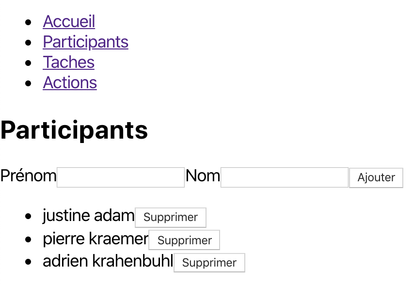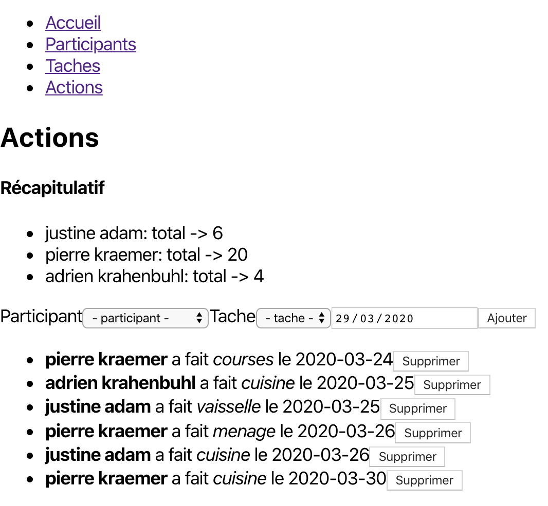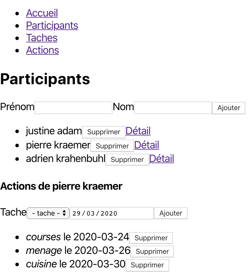 +En plus d'afficher l'ensemble de toutes les actions effectuées dans la partie __Actions__ de l'application, ajoutez un lien `Détails` à côté de chaque `Participant` dans la partie __Participants__ de l'application.