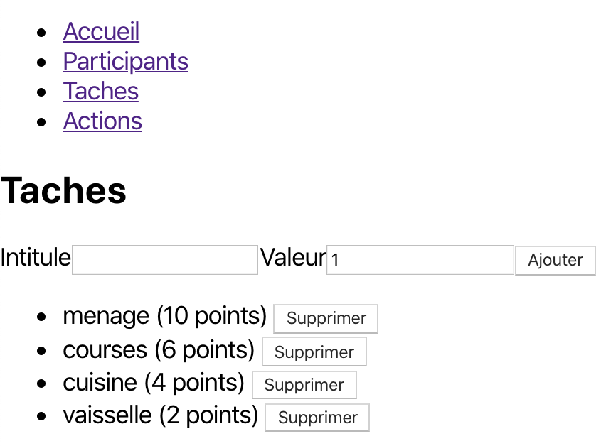 +L'application permet de gérer la liste des participants, la liste des différentes tâches qu'il est possible d'effectuer et bien sûr de saisir des actions, c'est-à-dire le fait qu'un participant réalise une tâche à une date donnée.